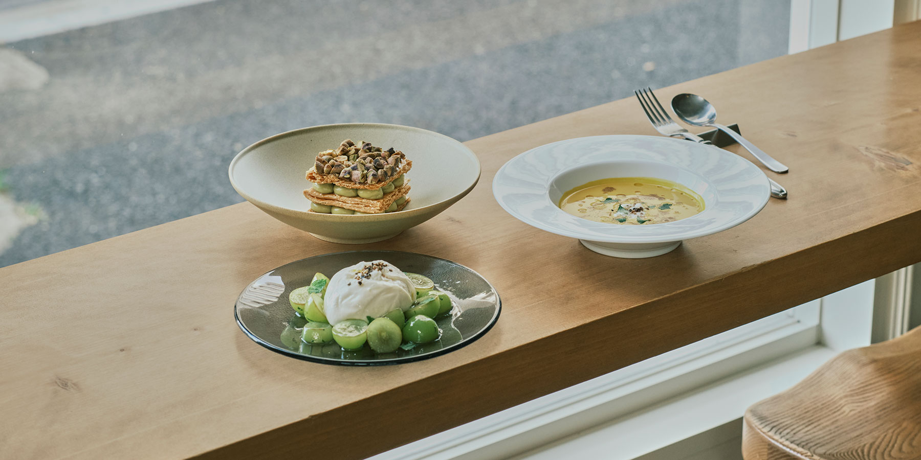 スープからパン、一品料理、デザートまで。それぞれの料理に合わせて器を選ぶと、テーブルの雰囲気がより豊かになる。vol.1では、前菜・スープ・デザートを中心に、軽やかな3皿をご紹介します。